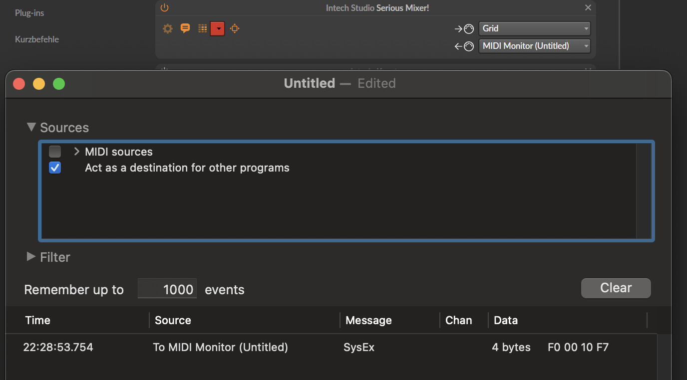 I also tried adding a SysEx block to one of my buttons and this works. So it seems like the it’s working when the SysEx message ist emitted by the grid itself, but it’s not working when sending SysEx from an external source.